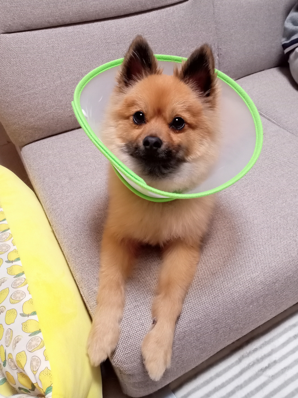血液検査のため採血し、狼爪のとこのちっこい肉球の付け根が腫れたので、抗生物質を出され、1週間のカラー生活となりました。